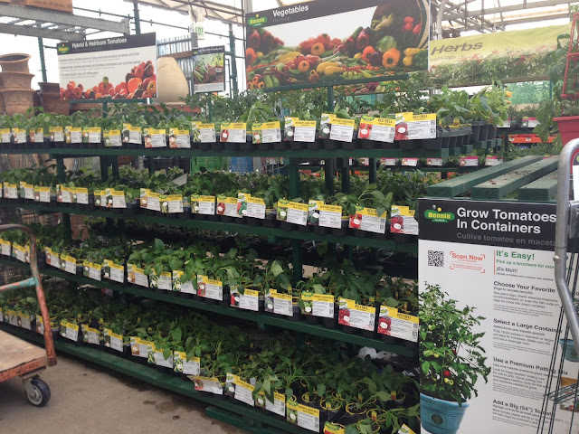 Tercera decisión: Las plantas de verduras y flores. Como ven en la primera foto la variedad puede ser abrumadora... afortunadamente Home Depot tiene información en inglés y español que los orienta. Los tomates para macetas están claramente identificados. Algunas cosas en que fijarse:
