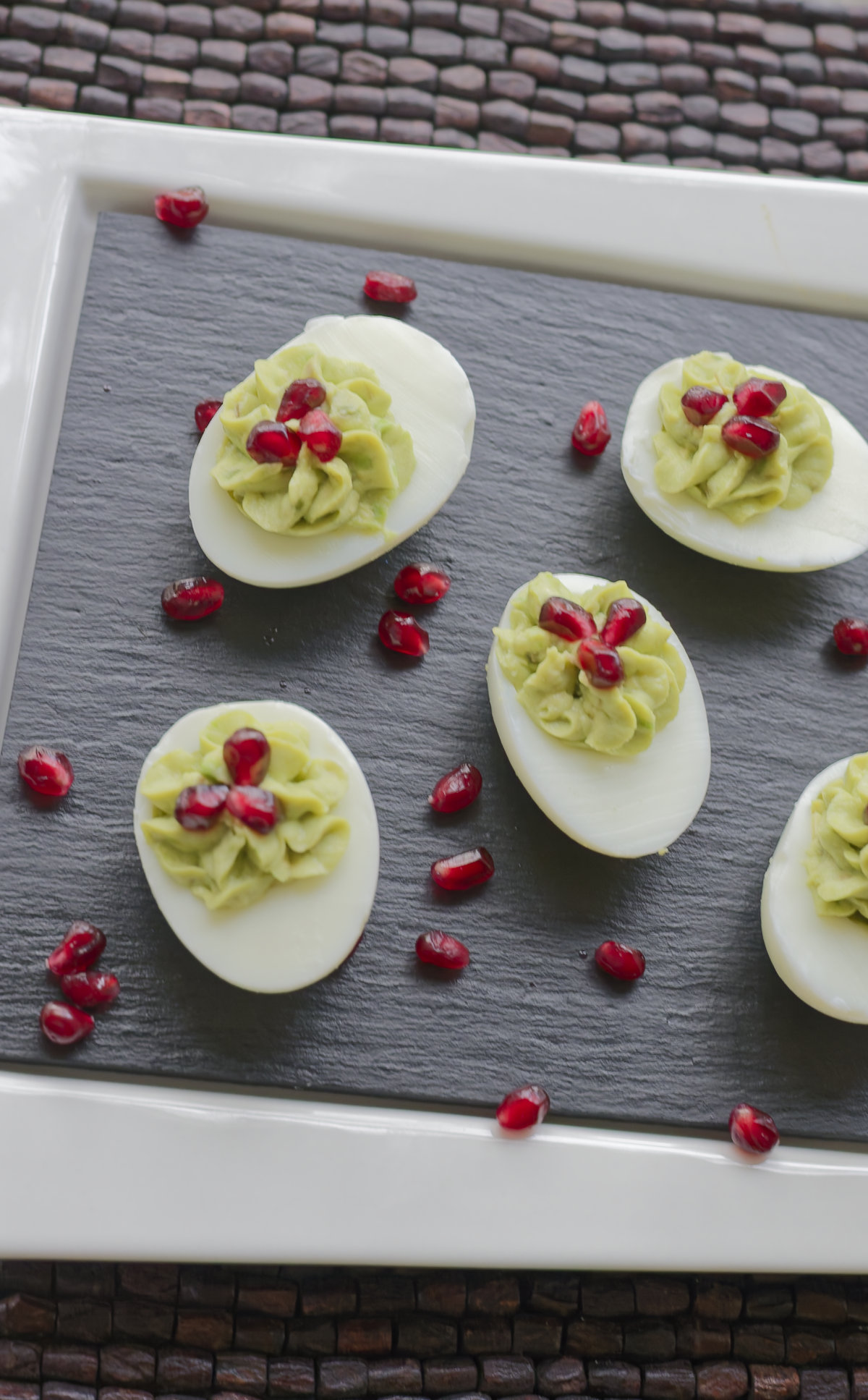 Me encantaron estos huevos rellenos con palta. Tienen un toque muy navideño con los colores de la palta y la granada, y la combinación de sabores es muy refrescante y deliciosa.