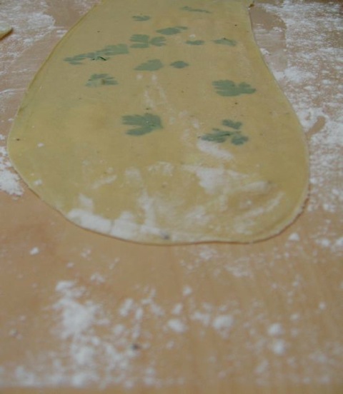 Para la lasaña se debe preparar la receta de pasta casera y extenderla con la máquina de hacer pasta (enlace afiliado) hasta obtener un grosor delgado-medio. Poner las hojas de perejil u otra yerba (sin las nervaduras) y doblar la masa sobre si misma y volver a pasar por la máquina de hacer pasta.